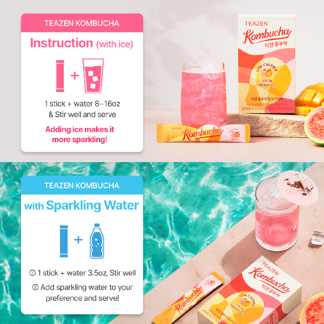 - Portable & Soluble : Just drop one TEAZEN Kombucha packet to cold water (about 8.5oz (250ml) and mix. TEAZEN Kombucha dissolves in 3 seconds. Very simple and convenient to easily get into the habit of drinking Kombucha.